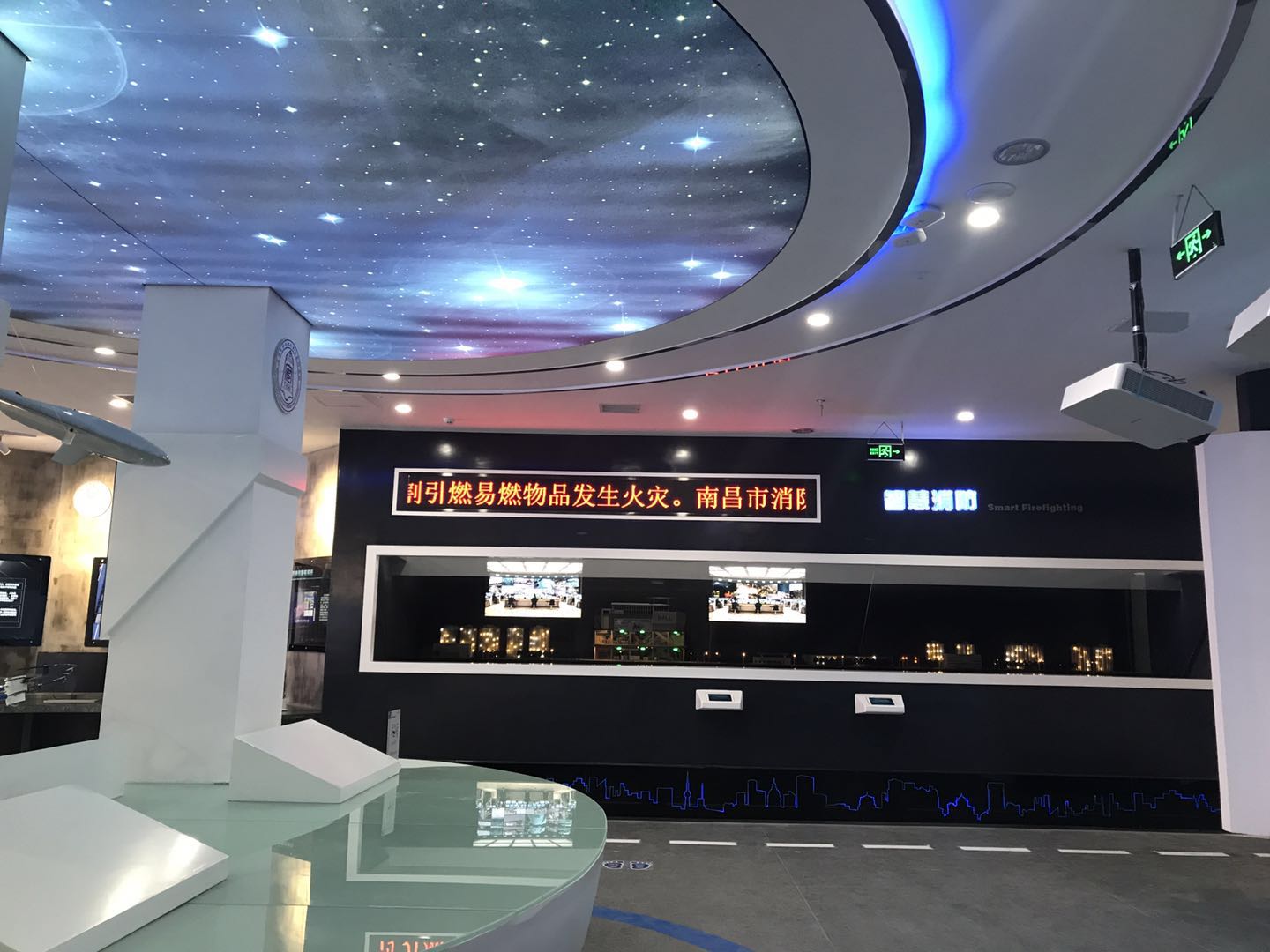 整個(gè)展廳共設(shè)“序廳”“城市生命線(xiàn)”“智慧園區(qū)”“智慧消防”“案例展示”和“尾廳”六大部分。我們?cè)谡故拘问缴希捎渺o態(tài)展示與動(dòng)態(tài)展示相結(jié)合,通過(guò)幻影劇場(chǎng)、體感互動(dòng)、立體沙盤(pán)等多模態(tài)展示技術(shù),令展示效果更加生動(dòng)鮮活。布展選材以節(jié)能、環(huán)保、生態(tài)為基本理念,使整個(gè)展廳由外到內(nèi)融為一體,簡(jiǎn)潔大氣,科技感、未來(lái)感十足。